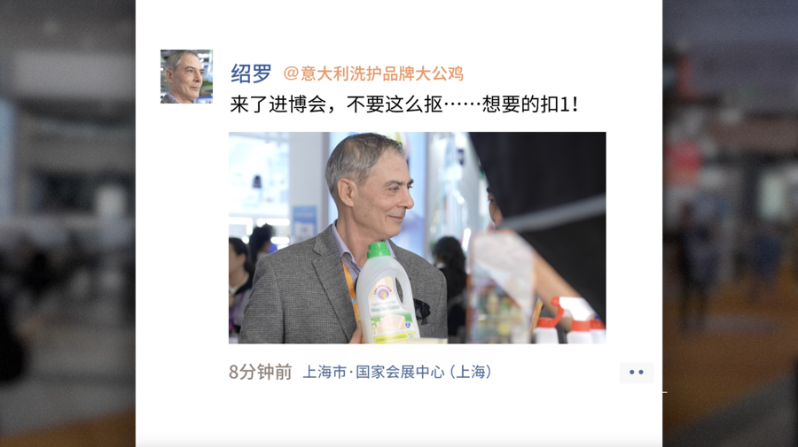 作为连续八届参会的“老朋友”,意大利大公鸡洗护品牌涉外总经理绍罗(Sauro)在进博展台尝试了直播带货。尽管是直播新手,他与团队配合默契,用“想要的扣一”等术语与中国观众互动。绍罗表示,意大利的线上销售规模有限,但他却十分看重直播这一形式。他认识到,直播能有效地向中国观众介绍品牌,进而帮助经销商提升销售。意大利大公鸡洗护品牌中国区总代理董事长金灵勇对此深表认同:“在中国,电商的销售跟直播的销售已经占了主流的销售渠道,所以在进博会里面,我们安排了很多个展位来做直播。”